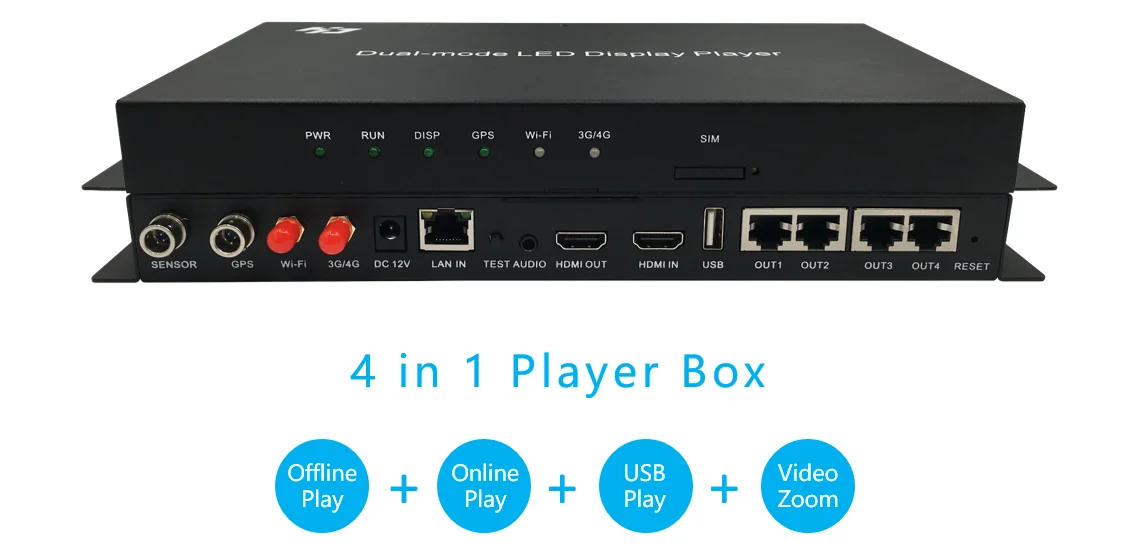 Maksimum destek 655,360 piksel LED ekran. HD video donanım kod çözme desteği. Destek 3G/4G/Wi-Fi Internet yönetimi. 1. Büyük ekran gönderme kartı Topluluk bilgi ekranları, reklam makinesi, reklam araçları vb. Için uygundur. A3 kutu + alma kartı altyapısı gönderiyor, bir alıcı kartı kaydedebilir. 2. Yüksek çözünürlüklü video donanım kod çözme 1.6GHz CPU, 8Gb bellek, en yumuşak video oynatma. Destek 1080P HD video sert kod çözme, mükemmel video efekti. 4 saatten fazla HD video dosyası saklamak için destek. U-disk ile doğrudan içe aktarma videosunu destekleyin, oynatın ve takın.
